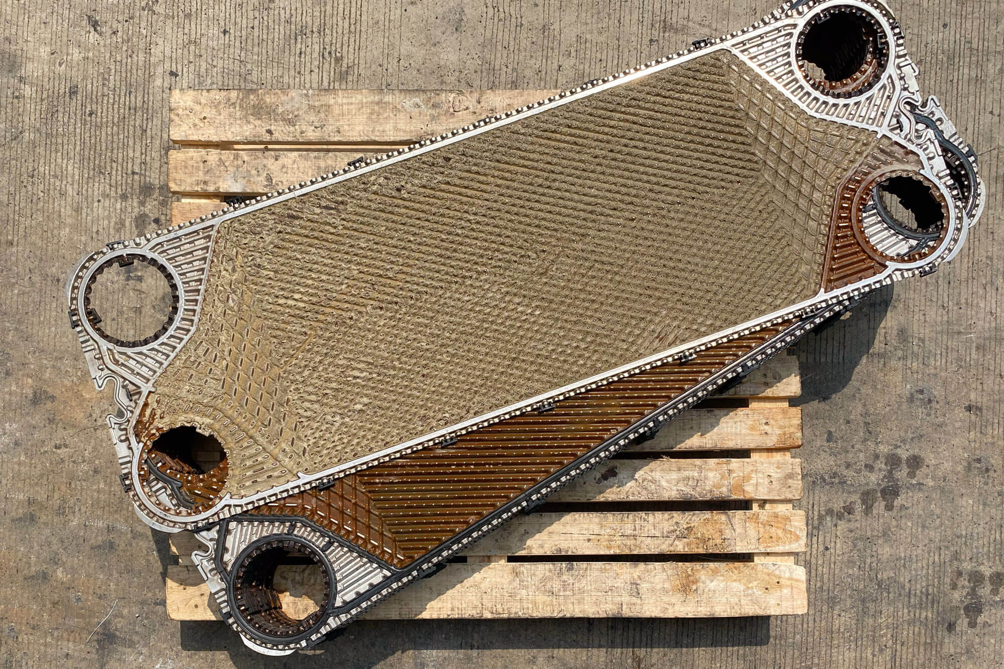 - Stap 1: ingangscontrole: Na ontvangst van uw platenwarmtewisselaar of platenpakket wordt er eerst geïnventariseerd en geïdentificeerd. Elke plaat wordt optisch gecontroleerd op vervormingen, gaatjes en/of scheurtjes en corrosievorming. Hierna wordt er een inschatting gemaakt van welke stappen noodzakelijk zijn voor het verdere reconditioneringsproces.